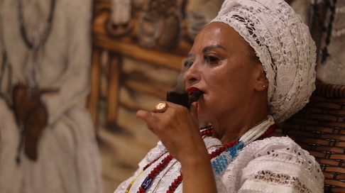 Ainda ocupando o lugar da cadeira de balanço, agora com um cachimbo para acompanhar o momento, Mãe Gardênia interpreta uma canção, uma que tem uma reza presente em seus versos, mostrando como ela pode estar presente de diferentes maneiras.